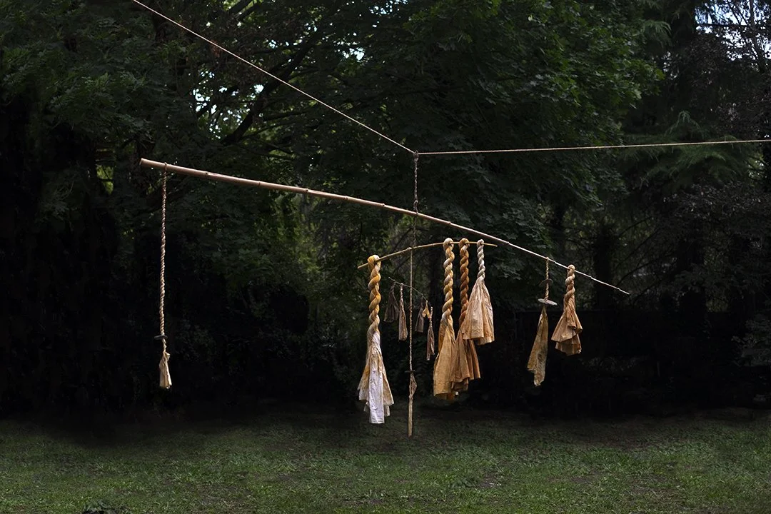 Bambou, Schiste, coton ancien torsadé à la main, teinture à la rouille et à la Ronce commune (Rubus Fruticosus)
