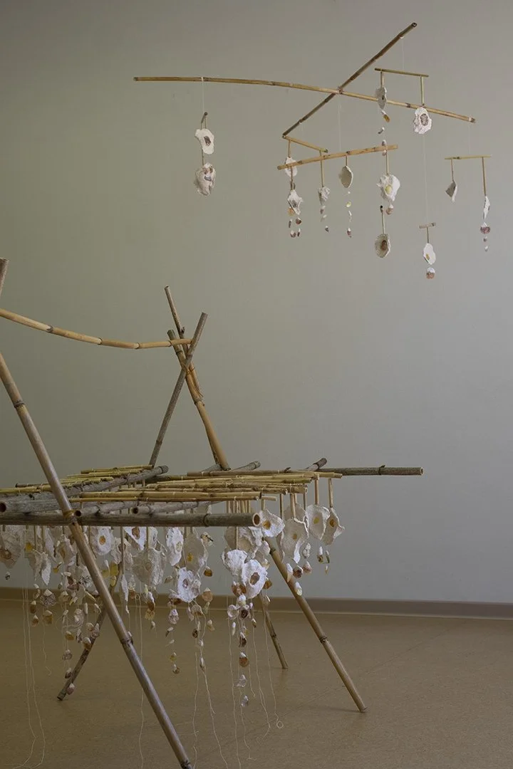 Coquillage Anomie pelure d’oignon (Anomia ephippium), papier recyclé, colle végétale artisanale, fil de lin,
