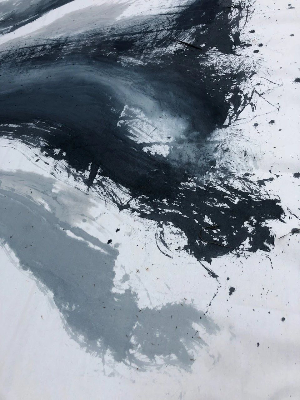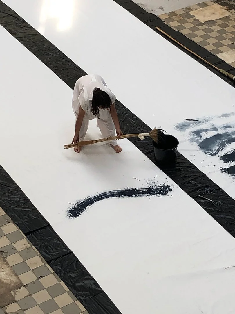 Je fabrique la peinture à partir de pigments végétaux d’indigo et les pinceaux avec différentes graminées que je collecte dans l’environnement.